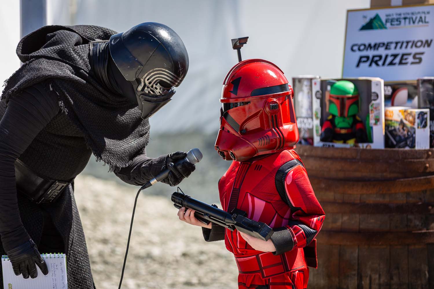 A young boy talking to a star wars character