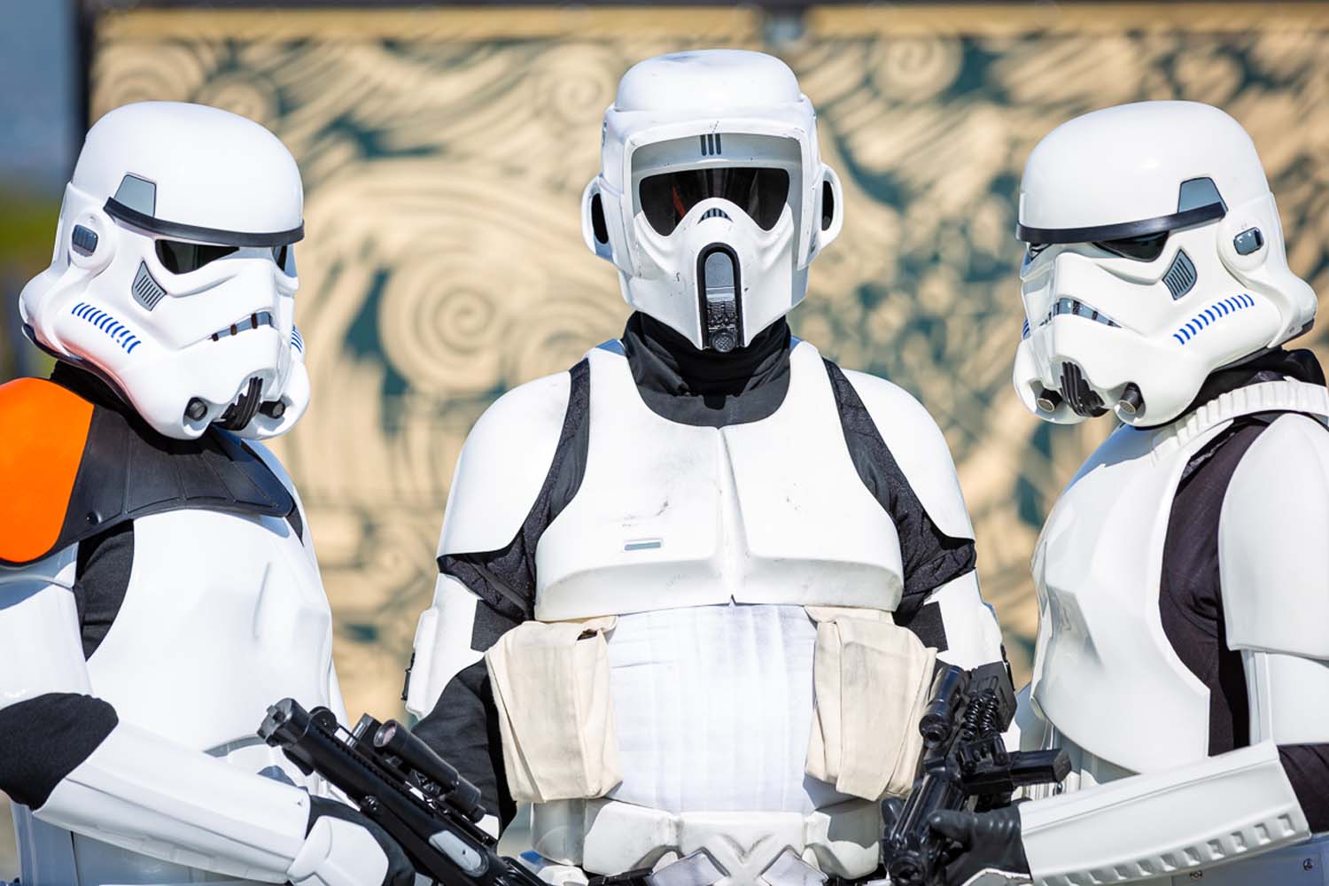 Storm troopers posing in front of a mural